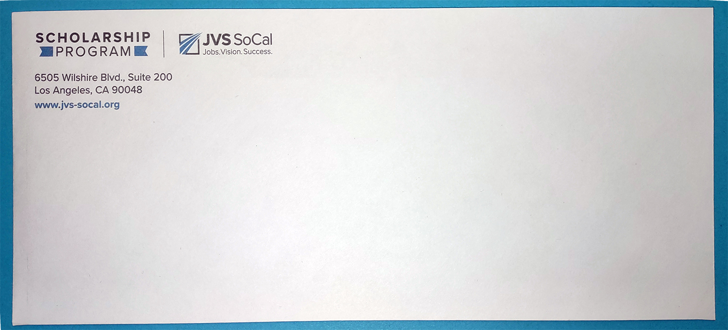 - JVS SoCal Scholarship logo and return address in upper left corner